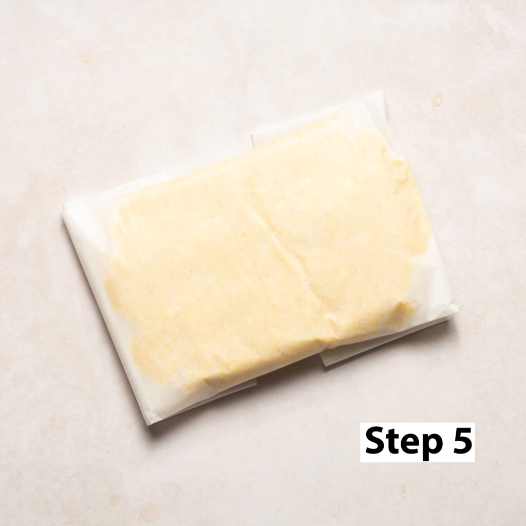 Step 5. Turn the dough out onto a sheet of parchment paper (about 2 feet long) shaping it into a square/rectangle. Wrap in the parchment paper to cover then chill for 20-30 minutes until firm. While the dough chills, make your cranberry filling.