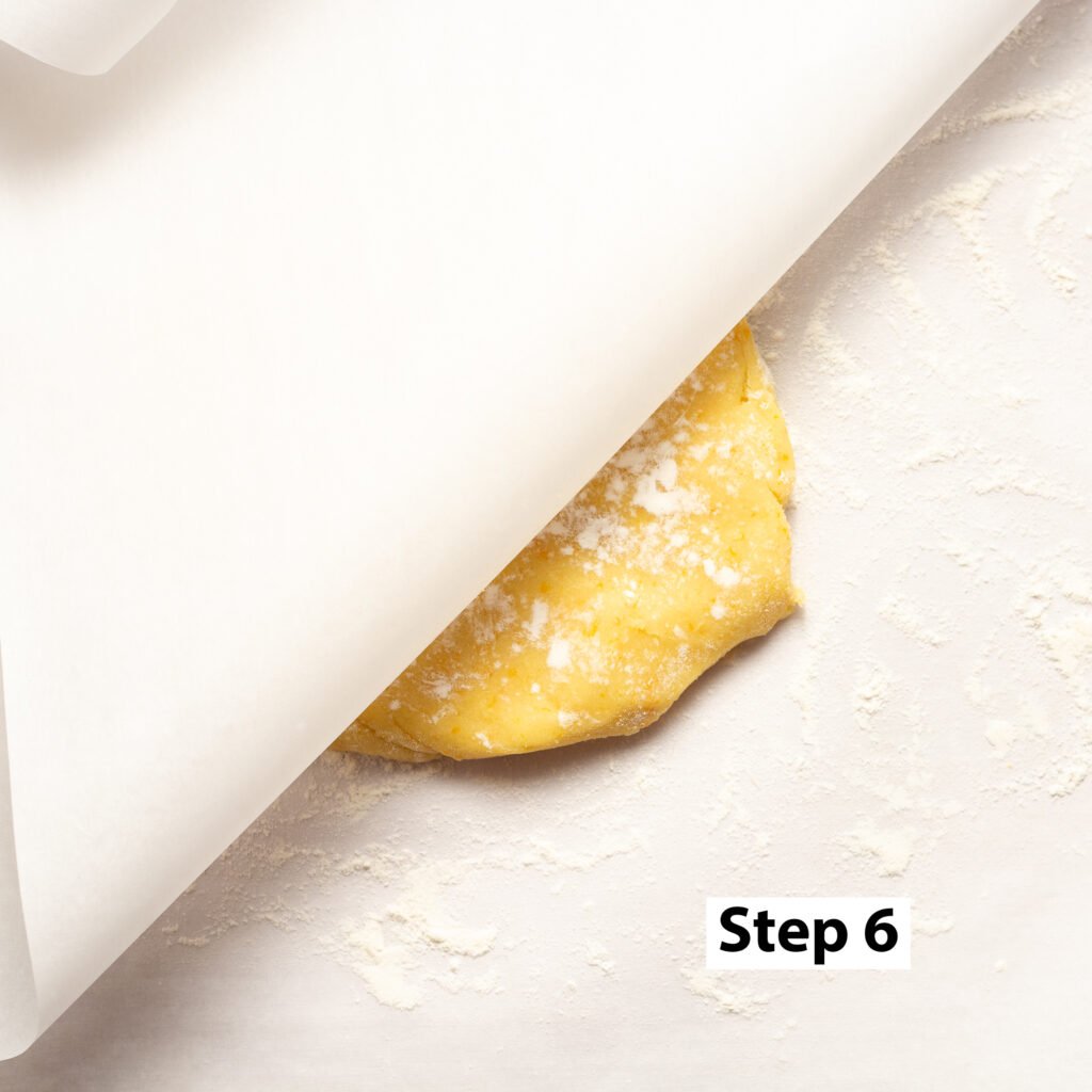 Step 6. Once the dough has been chilled, unwrap the parchment paper and sprinkle with flour on both the top and the bottom to prevent sticking. Take another sheet of parchment paper of equal length sandwiching the dough.