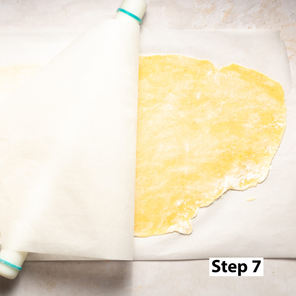 Step 7. Using a rolling pin with optional, but highly recommended, guide rings roll the dough out to 2-3 mm thickness. Peel back the parchment paper periodically and dust with more flour as needed to ensure the dough does not stick to the parchment paper. Remember to flip the dough as well ensuring that this is done to both sides of the dough.