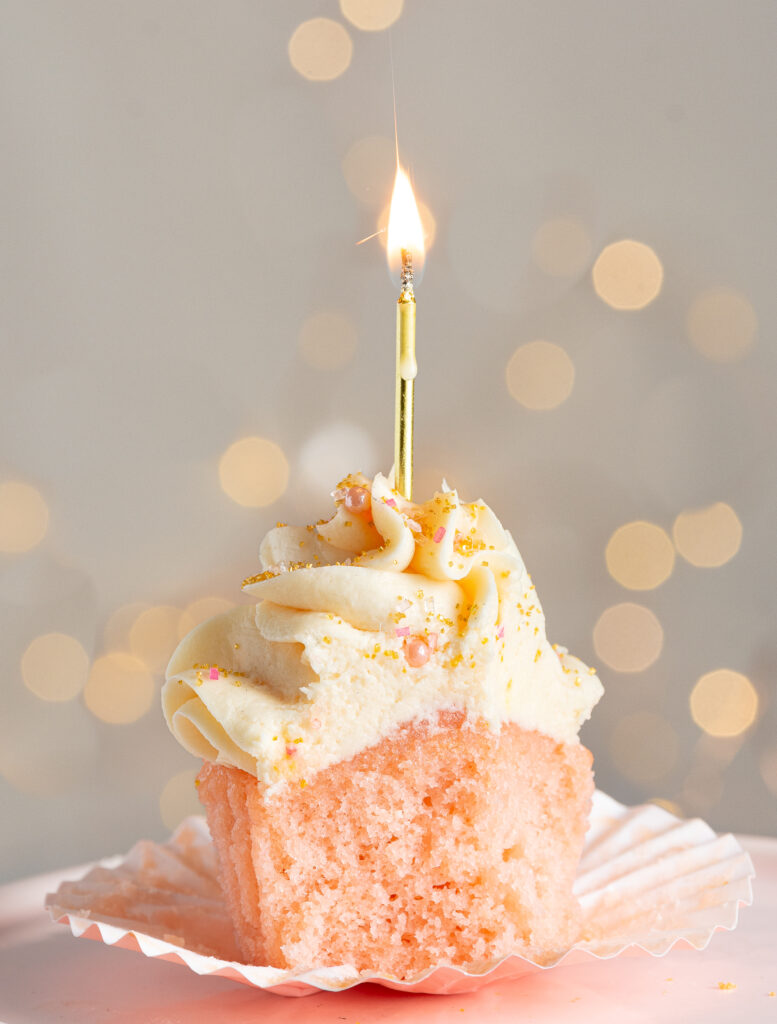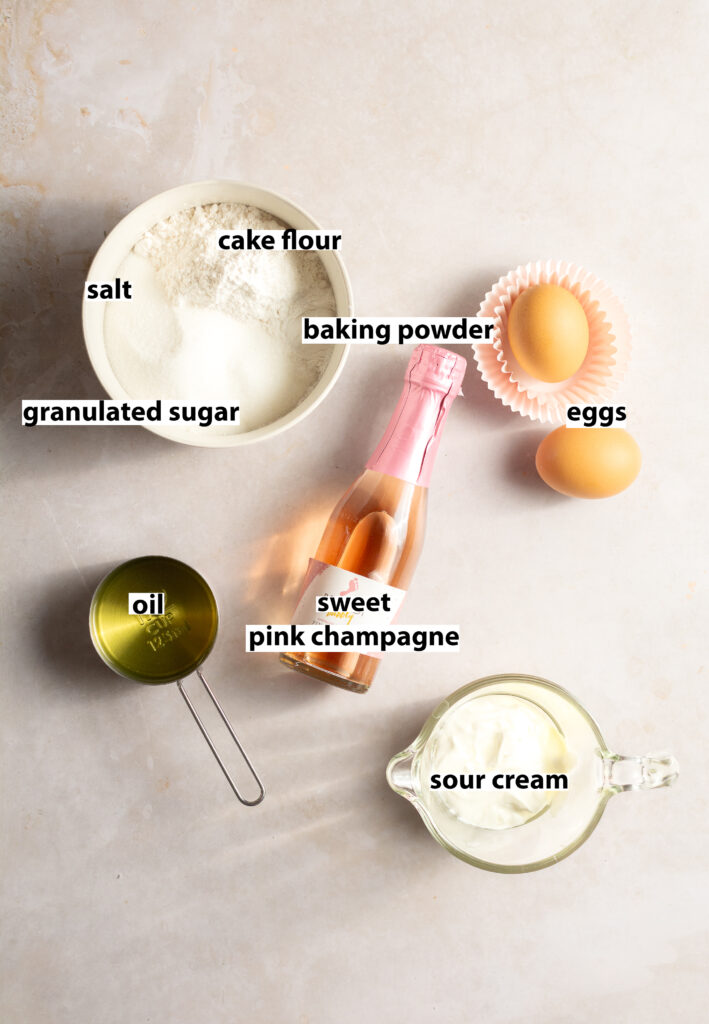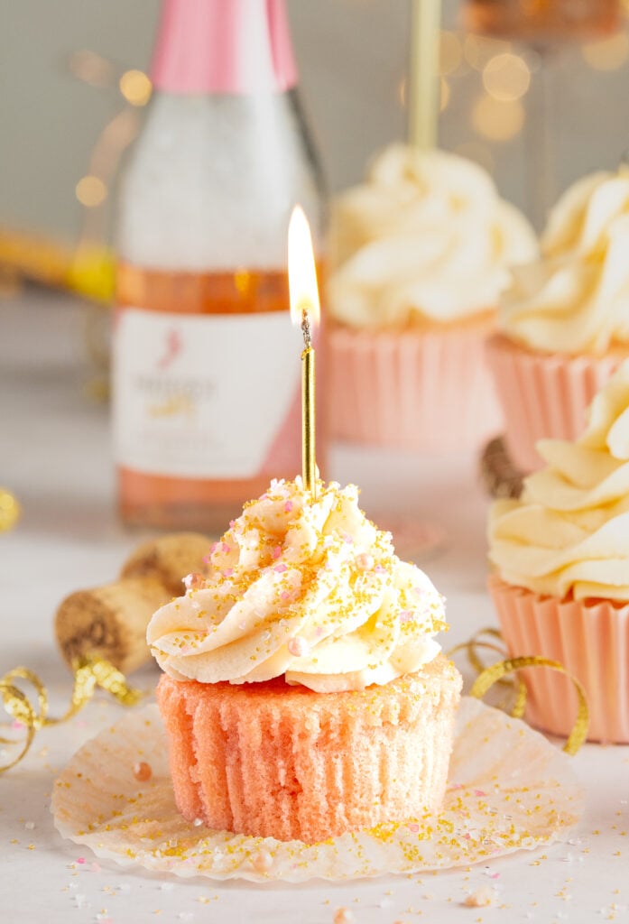 Pink champagne. Pink or rosé champagnes have more fruity notes that are perfect in baked goods plus the carbonation contributes to the airy texture of these cupcakes.