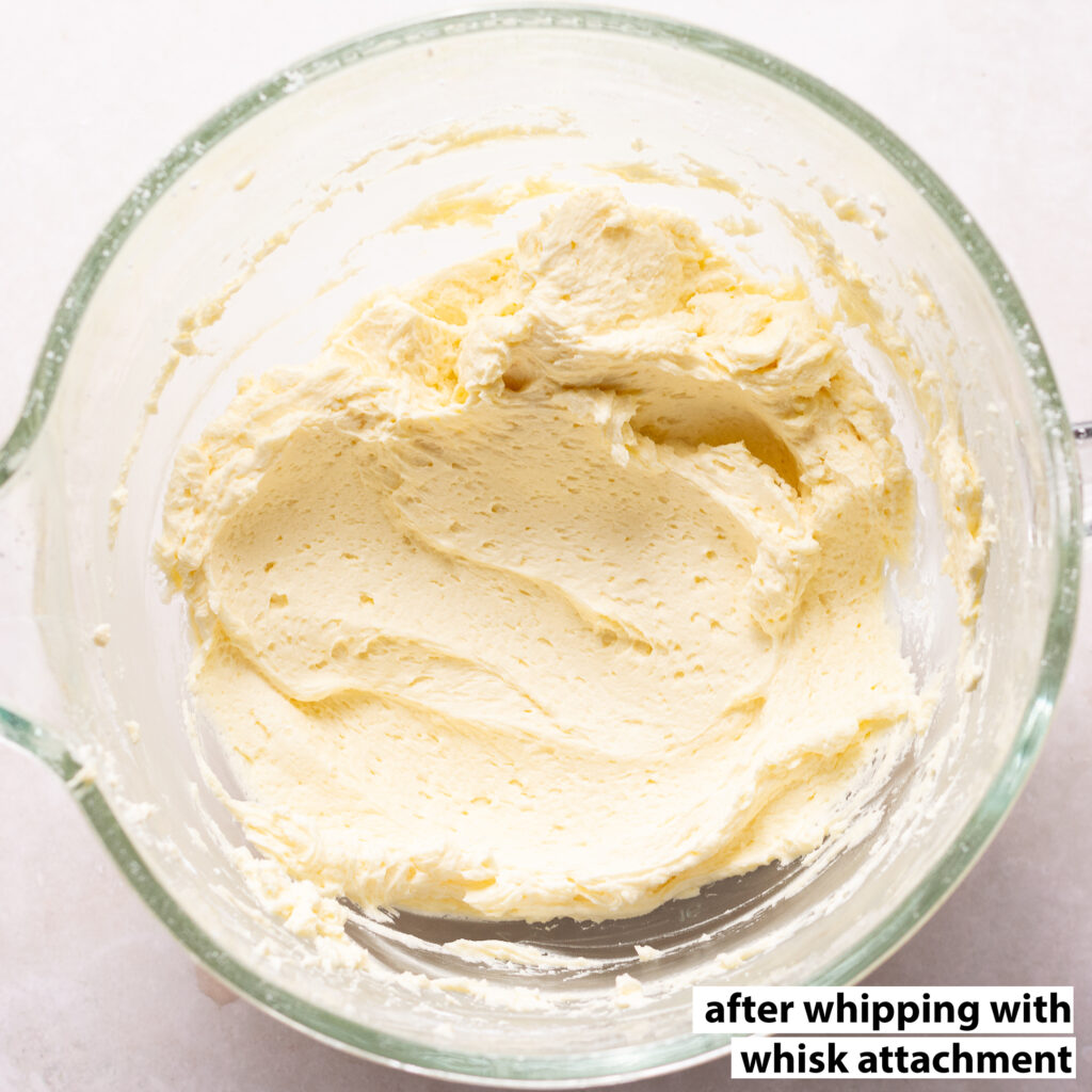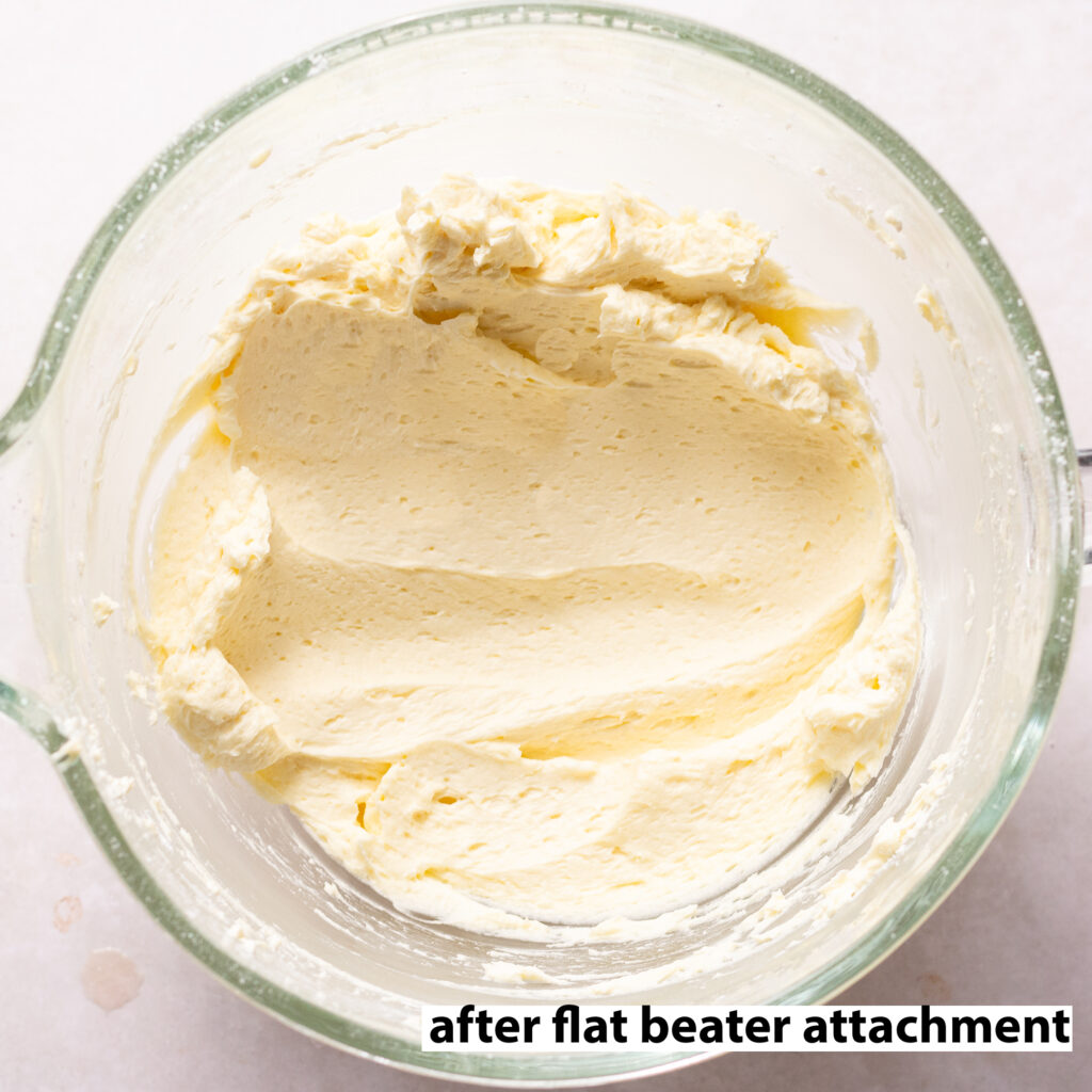 Using a whip/whisk attachment at this stage ensures a light and fluffy buttercream but can cause some very large air bubble as shown below. Switching to a flat beater will help knock out these large air bubbles.