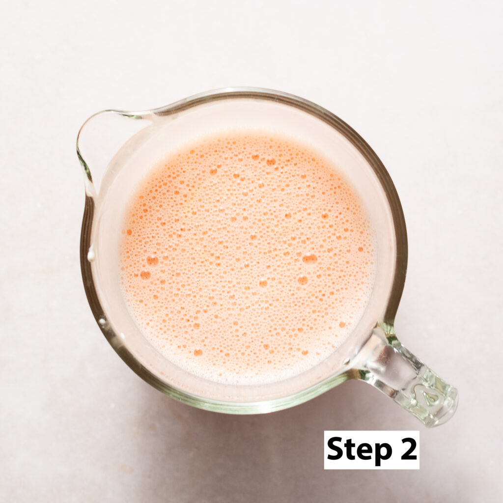 Step 2. Add the eggs, pink champagne, sour cream & red/pink food coloring (if using) in a bowl and whisk til smooth. Set aside.