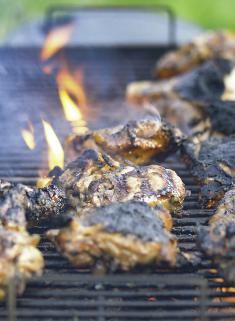 - Add chicken thighs to grill (do NOT discard marinade), allowing to char to your desired color on each side and then moving to the low heat section of your grill to finish coking all the way through (see tips in post).This will take a total of about 4-7 minutes on each side.