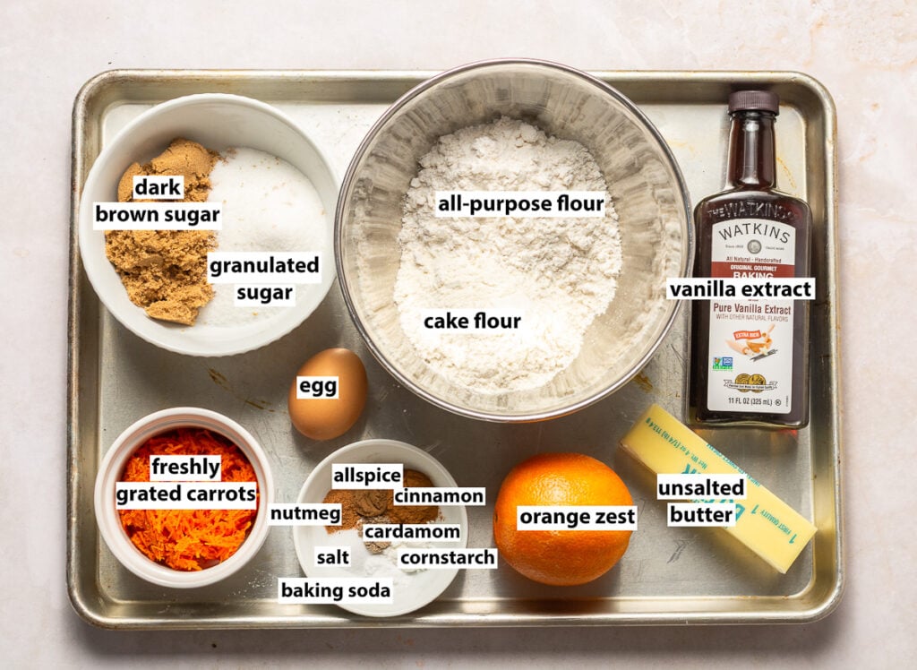 Flour. A blend of all-purpose flour and cake flour is used in this carrot cake cookie recipe, similar to my other cookie recipes. The all-purpose flour contributes adequate gluten so the carrot cake cookies hold their shape. The cake flour makes the cookies more tender and soft.
